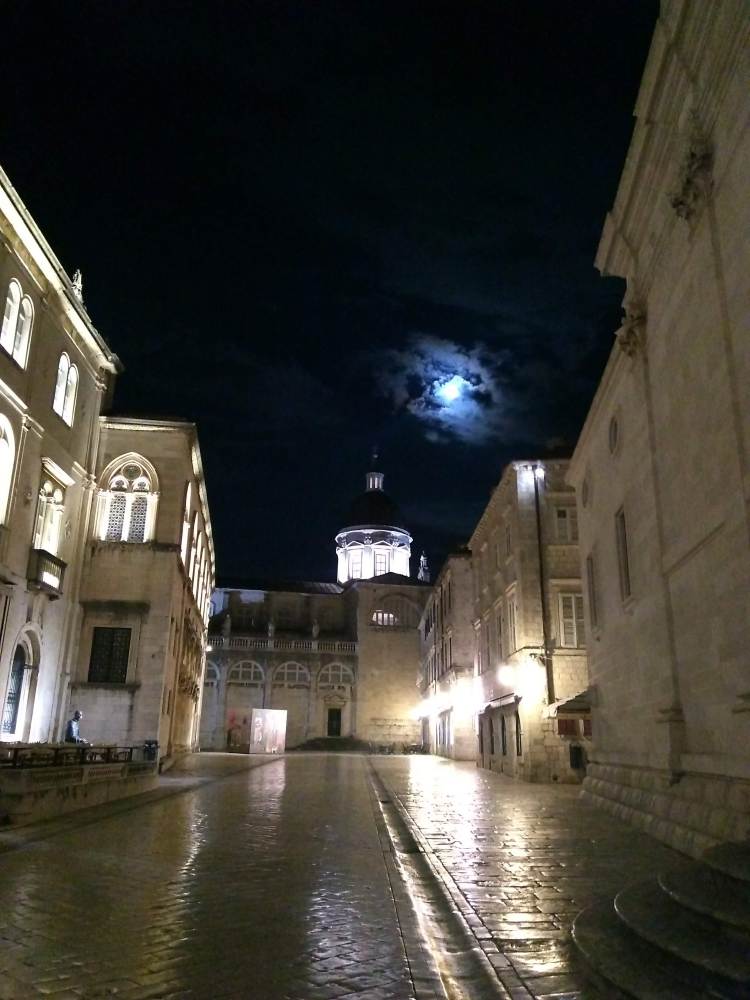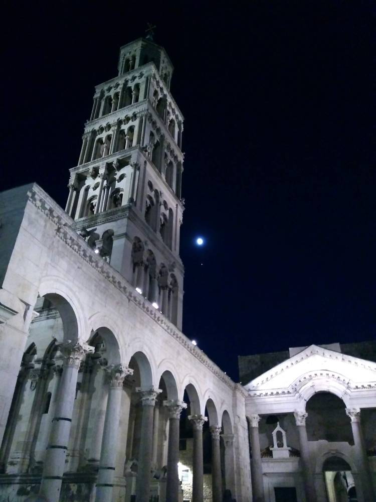 Las calles se limpian de turistas (o de la mayoría de ellos) los monumentos se iluminan y si, con un poco de suerte, hay luna llena, una puede presenciar espectáculos como éste: la catedral de Split a las 23.03 pm.