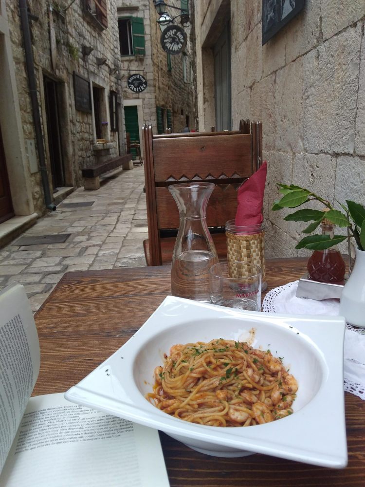 Croacia limita con Italia. Las pastas, el vino y el helado son palabras mayores. Por mi parte, disfruté unos Spaghetti con Camarones en una trattoria familiar y tradicional, en un callejón viejo y con un libro como cita. De 10.